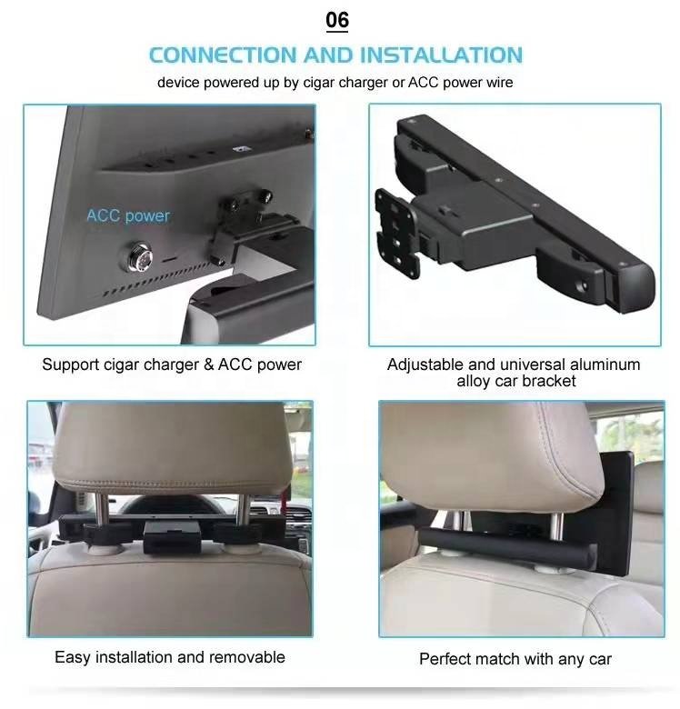 Durable, Vehicle-Ready Design:Housed in a rugged ABS shell and powered by DC 12 V, this monitor is built for automotive environments, consuming just 24 W (12 V/2 A). Available in sleek black, it seamlessly integrates into cars, MPVs, and business vehicles for a polished, factory-installed look.