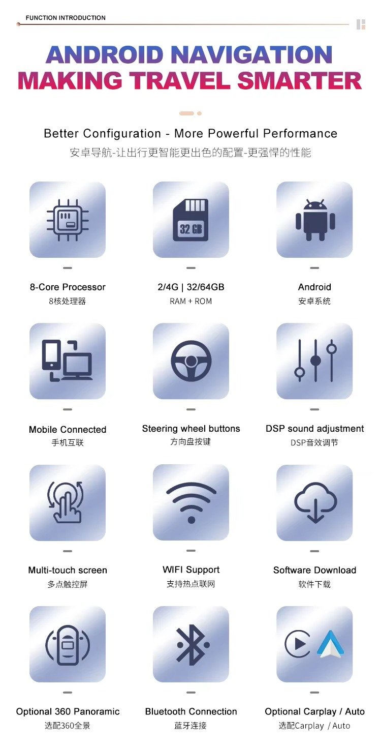 High-Performance Android 12 System: Powered by an 8-core CPU, the system runs smoothly on Android 12, offering faster responsiveness and better multitasking. RAM options range from 2GB to 6GB, with storage variants from 32GB to 128GB, providing ample space for apps, media, and maps.
