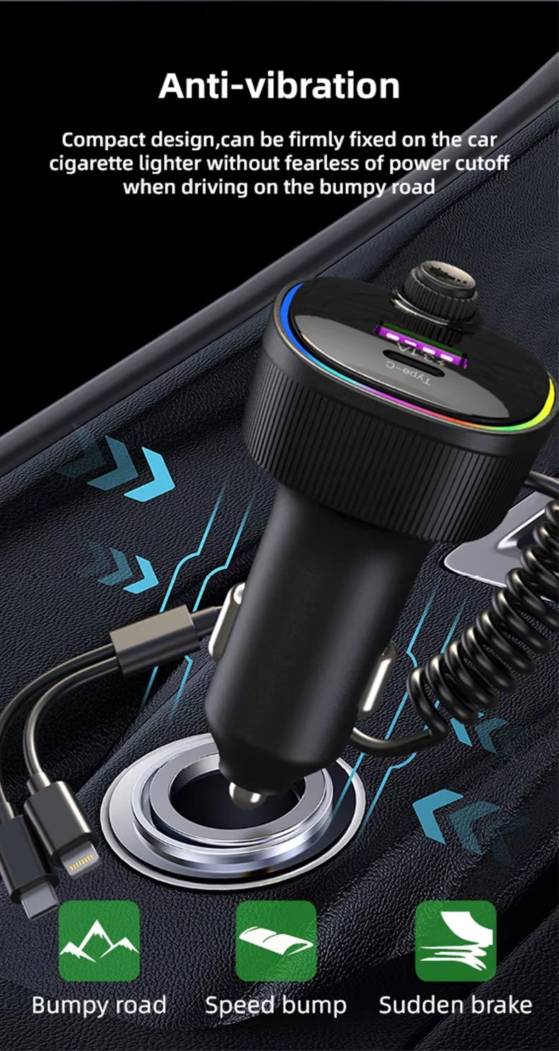 The Bluetooth 5.4 Car Charger is a cutting-edge charging solution designed for modern drivers. Combining ultra-fast 66W charging with Bluetooth 5.4 technology, this versatile charger keeps your devices powered while maintaining seamless connectivity. Featuring 4 charging ports and a spring-loaded cable system, it’s the ultimate all-in-one solution for your vehicle.