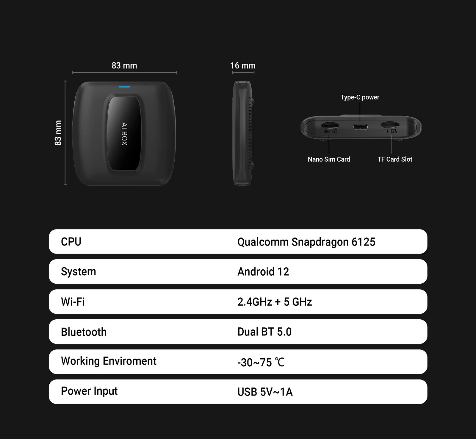 Compact and Portable – Small form factor with dimensions of 83 × 83 × 16 mm, allowing for easy integration into any vehicle interior.