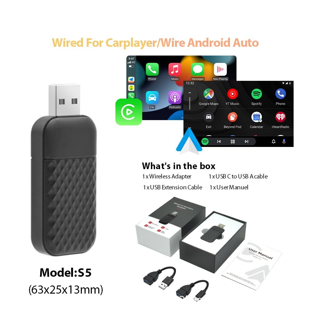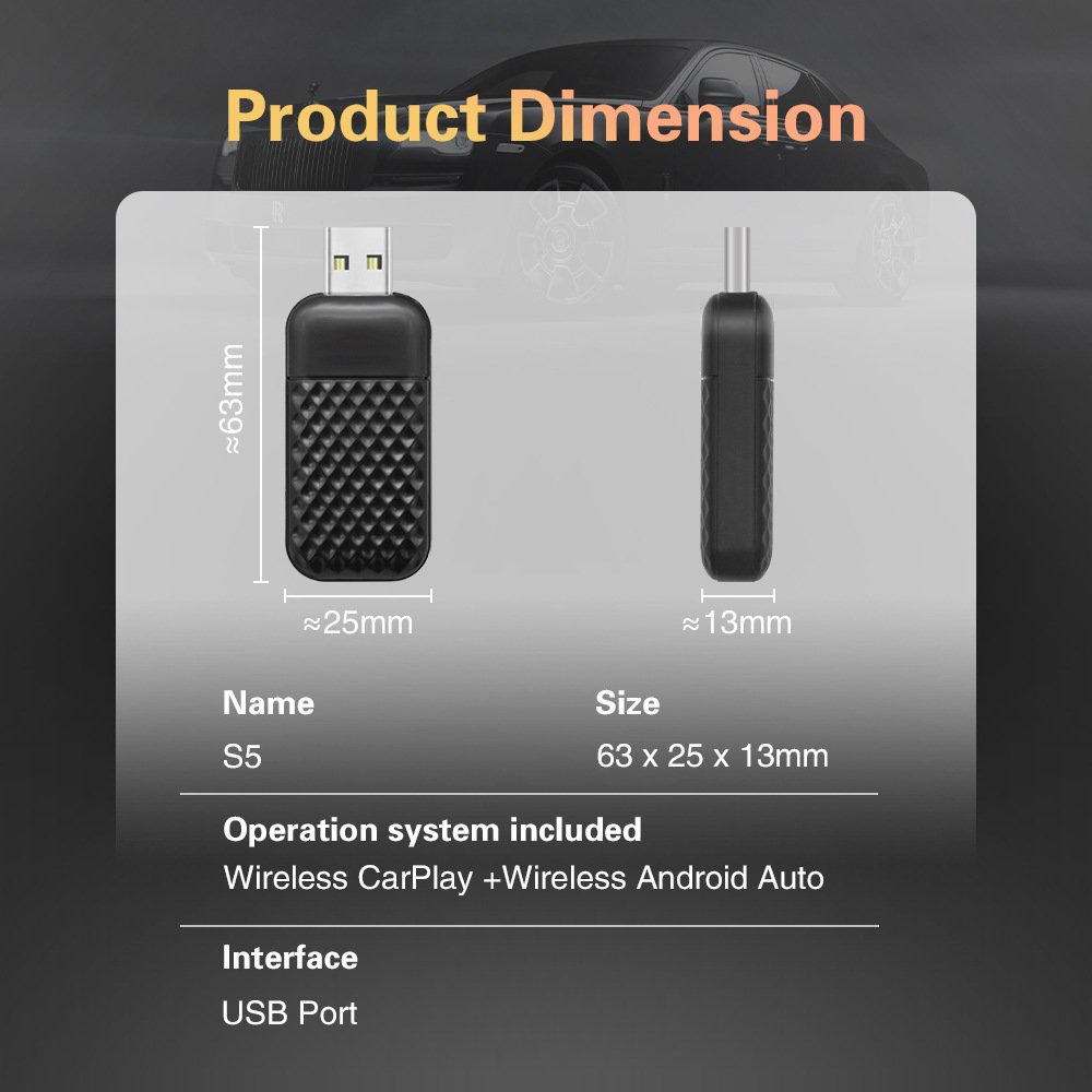 Unlock seamless wireless connectivity with the S5 CarPlay Box—a compact, plug-and-play solution designed to convert factory-wired CarPlay and Android Auto systems into a wireless experience. With intelligent system adaptation and universal compatibility, this device is perfect for drivers looking to modernize their in-car infotainment setup.