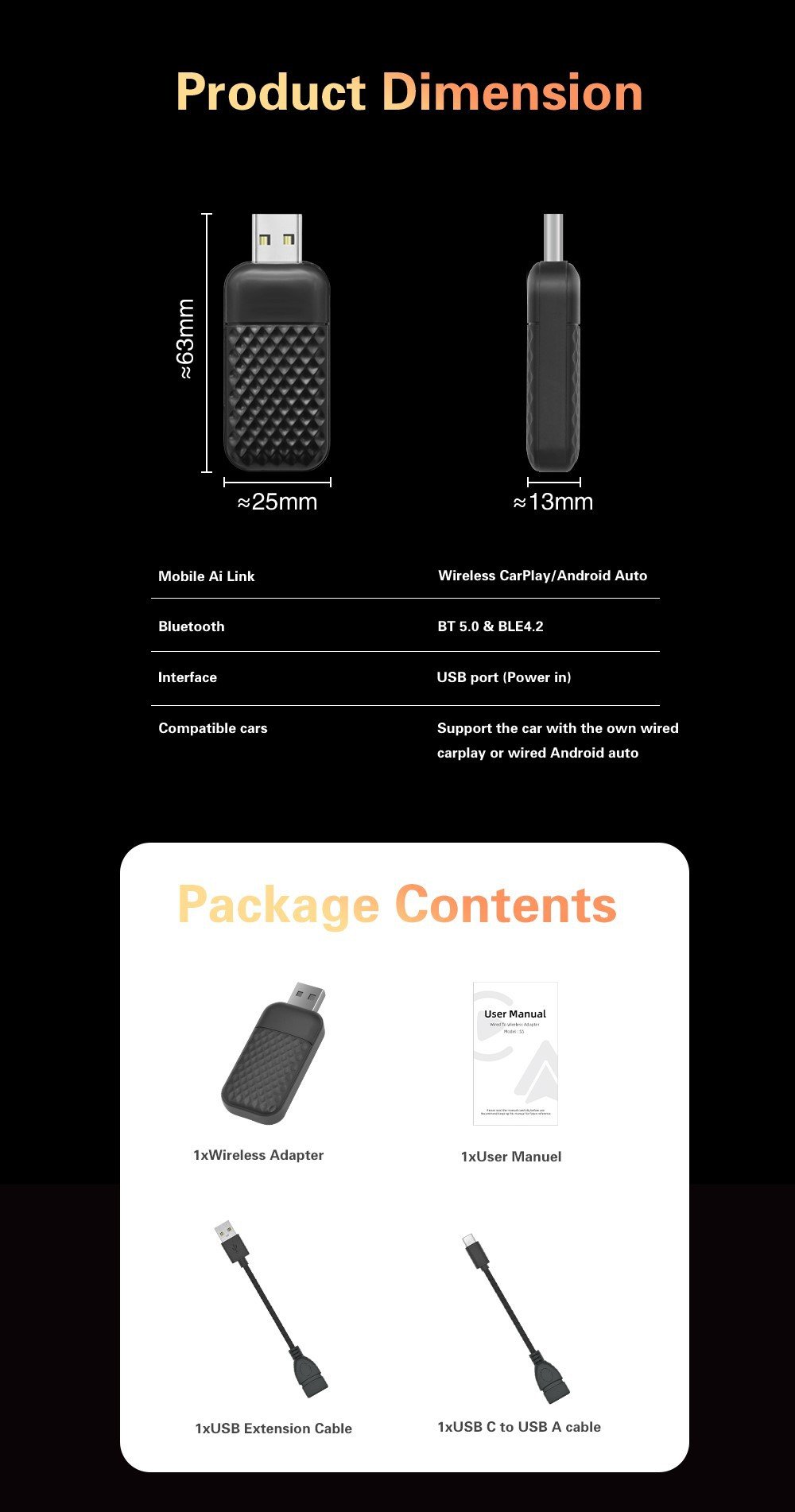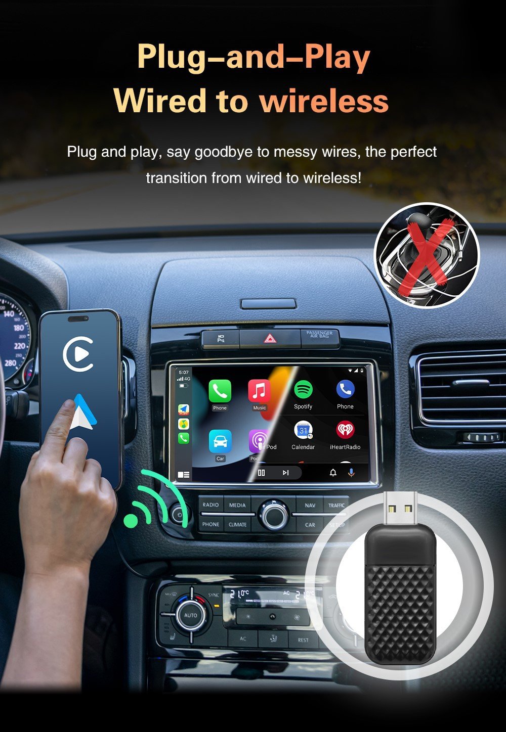 Compatible with Most Factory Systems: Designed for vehicles with built-in wired CarPlay or Android Auto support. Just plug into the USB port—no tools, apps, or head unit changes required.
