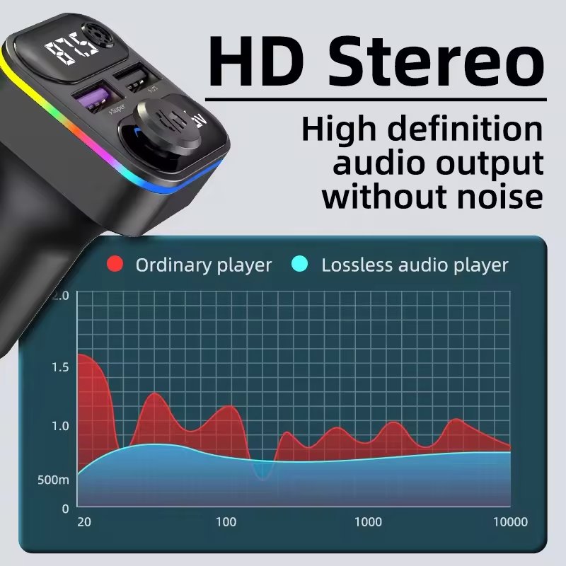 Crystal-Clear Audio Playback: Enjoy studio-quality sound with support for MP3 and WAV formats, delivering rich, distortion-free audio through your car speakers. The advanced digital signal processing (DSP) chip enhances bass and clarity, ensuring your music, podcasts, and audiobooks sound fuller and more immersive than standard FM transmitters.