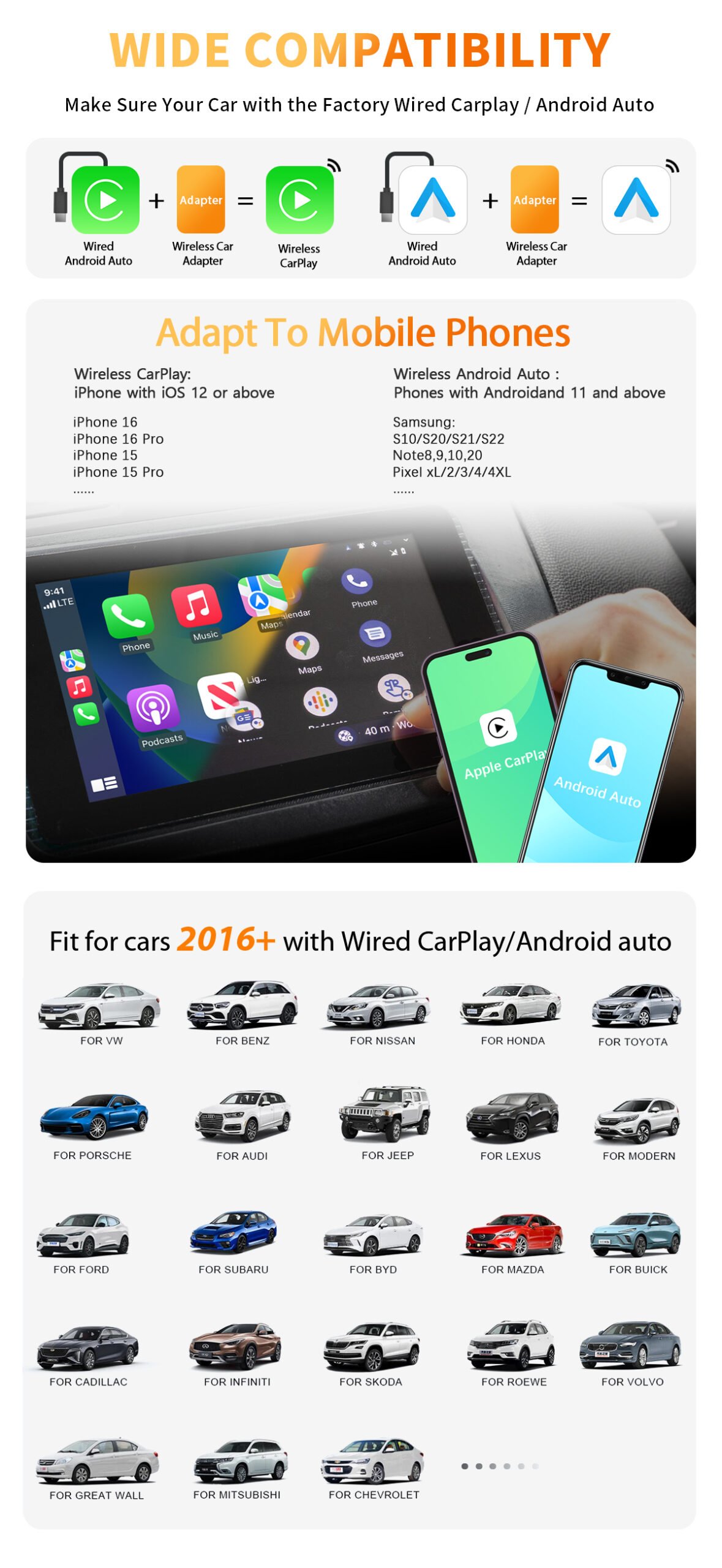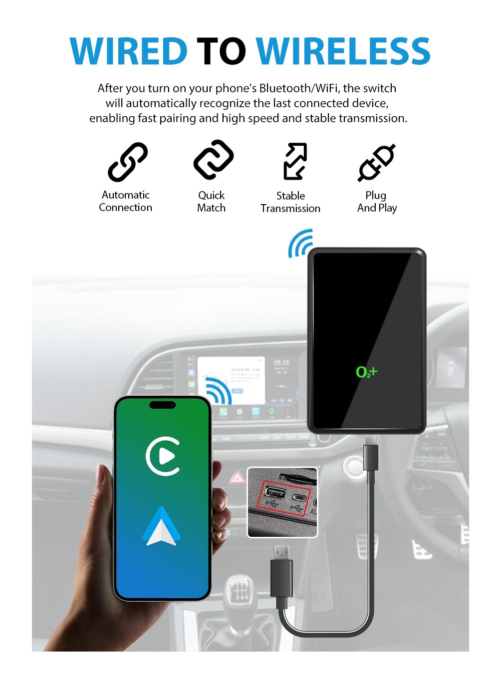 Universal Compatibility – Designed for cars with existing wired CarPlay, turning them into fully wireless infotainment systems.