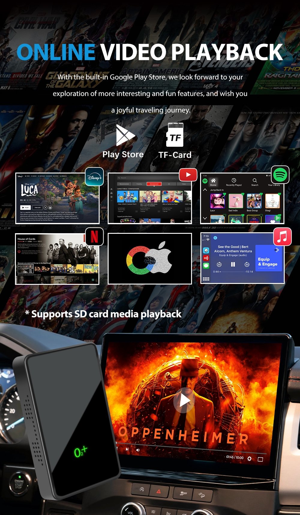 Dual-Channel Wi-Fi Transmission (2.4G/5.8G, Wi-Fi 6): Equipped with dual-channel Wi-Fi (2.4GHz and 5.8GHz) and Wi-Fi 6, the DriveMate ensures fast, stable, and reliable internet connectivity for smooth streaming, navigation, and app usage, even in areas with high network traffic.