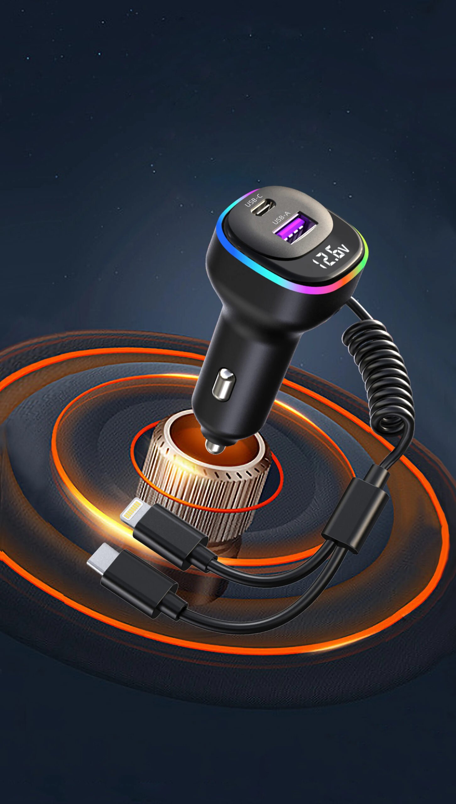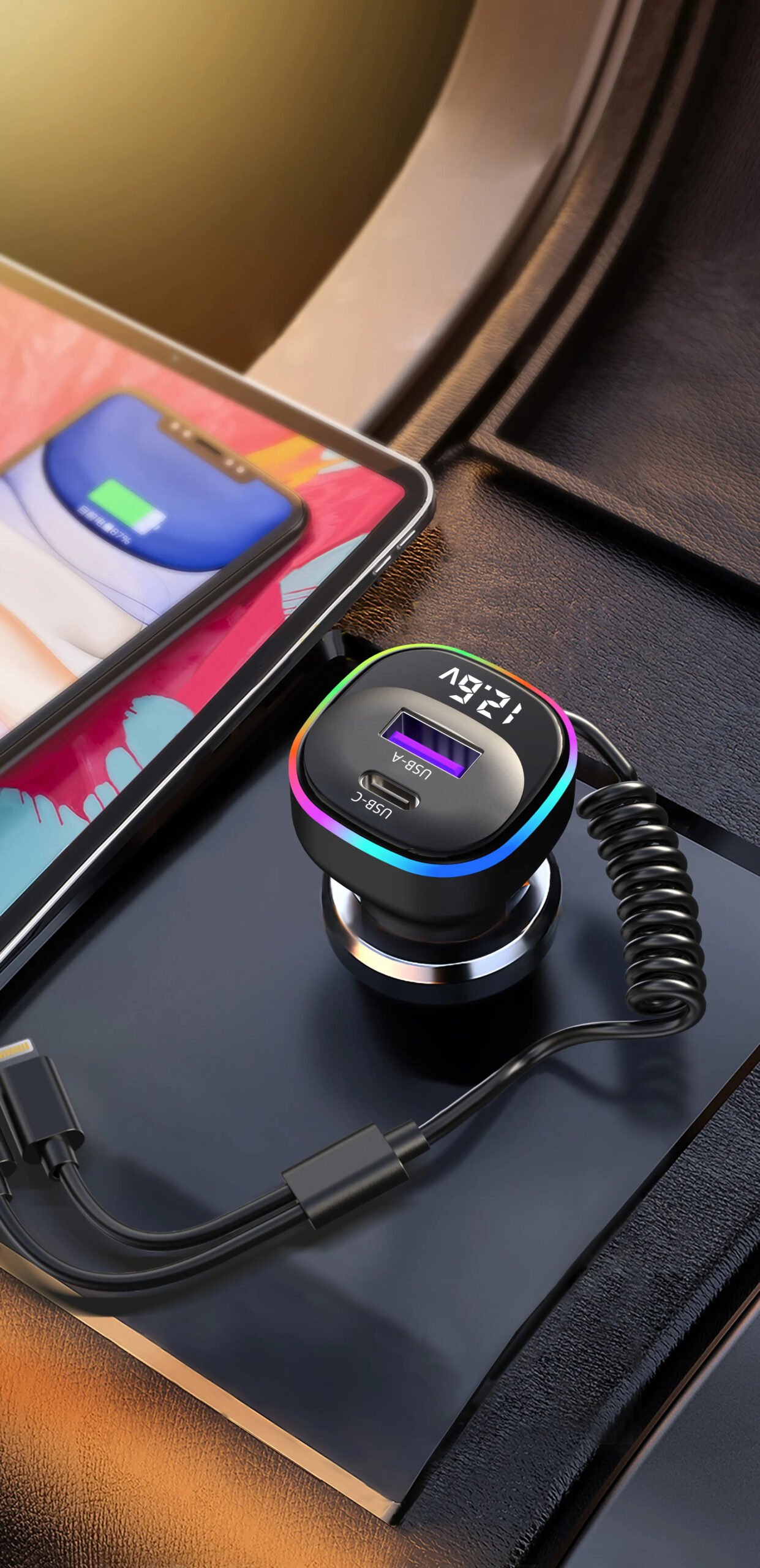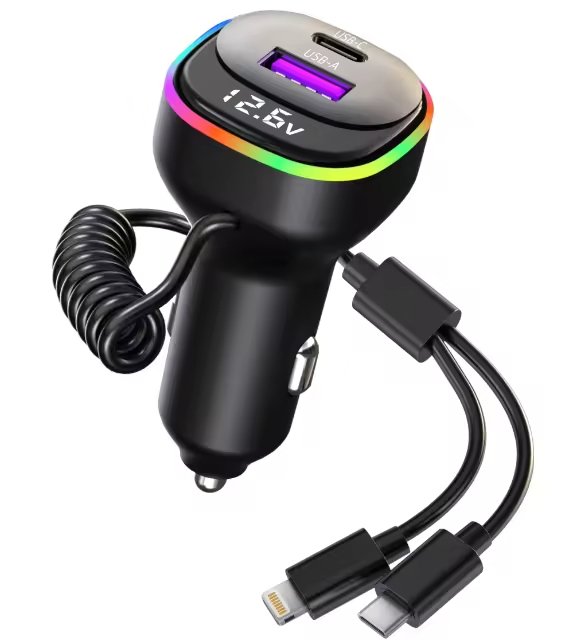 K2S Car Charger with 2 Cables: Dual-Port 65W PD Fast Charging