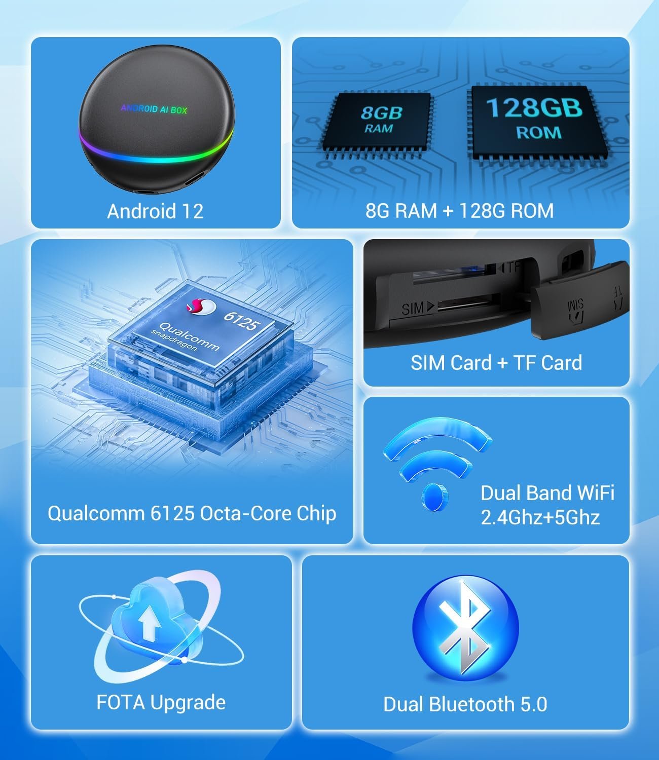 Powerful Android 12 OS: Equipped with the latest Android 12 operating system, the Smart Car AI Box offers a smooth, user-friendly interface with improved performance, security, and compatibility for modern apps and vehicle integrations.