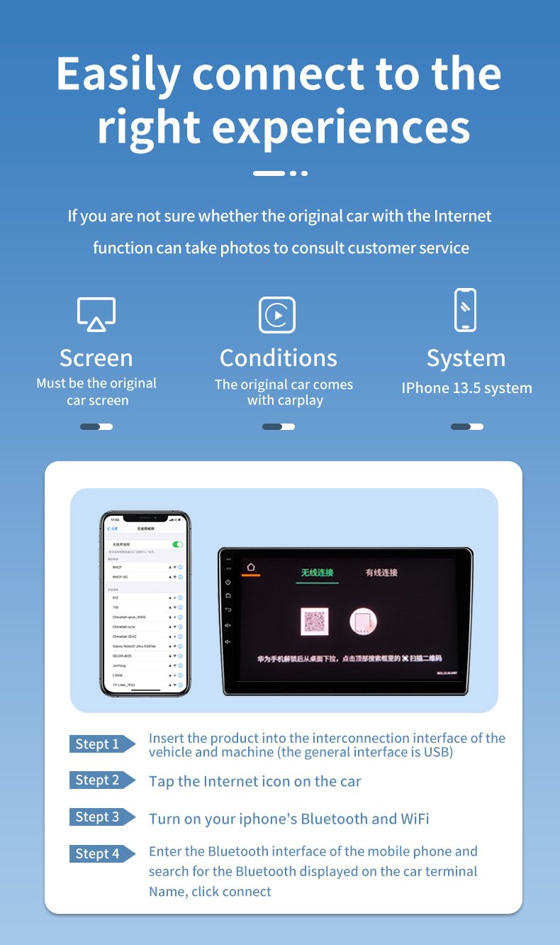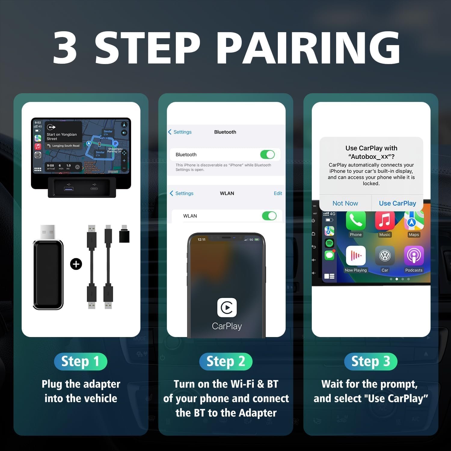 Plug and Play Convenience: Setting up the wireless adapter is incredibly easy – simply follow three steps to connect it to your vehicle. No additional apps or drivers are required. Once set up, the device automatically connects to your phone every time you start your car, ensuring a hassle-free experience every time you drive.